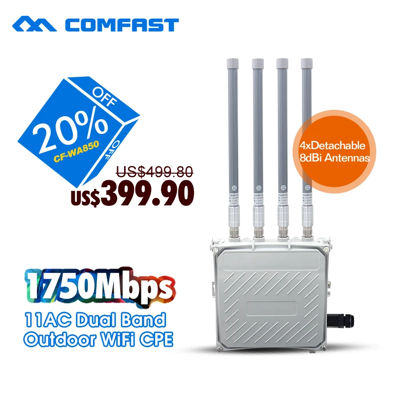 Good COMFAST 1750Mbps 11AC dual band outdoor AP 2.4G/5G Expander WIFI AP CF-WA850 802.11 AC WIFI Router for park wifi signal coverage For Sale at AliExpress. Have a look at our review to get the very best products you want. You can check out detail info regarding this item below. Check out our testimonial to acquire the excellent products you favor. You could check out detail information concerning this product below. Item rates and accessibility are exact as of the date/time suggested as well as undergo transform. Any kind of cost as well as accessibility details displayed on this website at the time of acquisition will use to the acquisition of this item.|You could check out detail information about this product listed below. You could review detail information regarding this product below. Any price as well as availability information showed on this site at the time of acquisition will use to the acquisition of this item